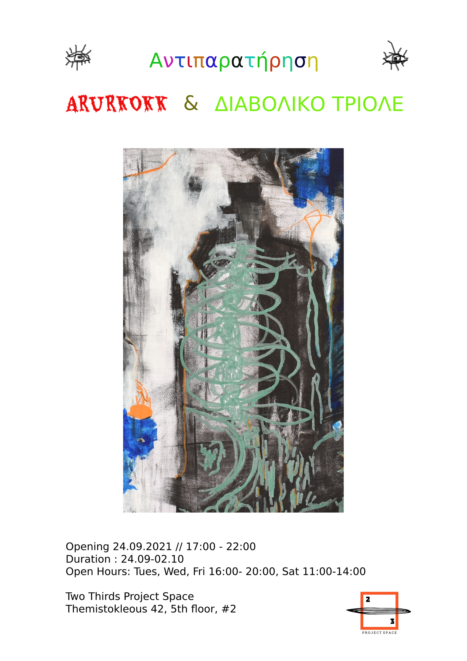 The above works gather and flood the space of a room where they will converse with the sounds of the experimental music group “Devilish Trio”, which will present its own observation about a live recording made during an earlier exhibition of Arurkokk.