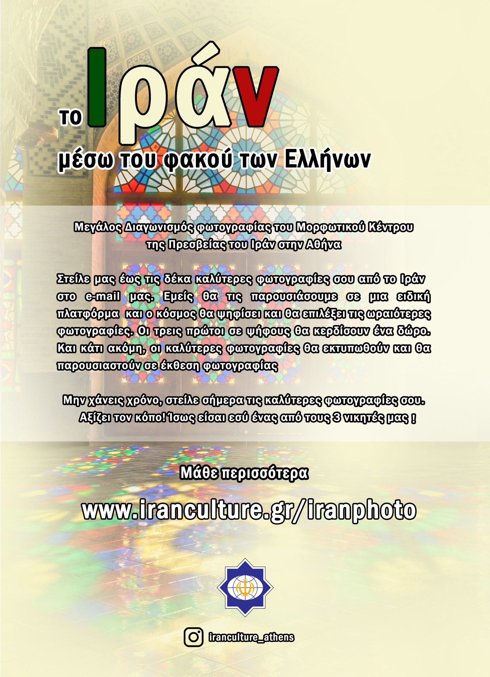 Στείλε μας έως τις δέκα καλύτερες φωτογραφίες σου από το Ιράν ( πόλεις, μνημεία, φύση, αξιοθέατα, ιρανικός λαός, τζαμιά κ.λ.π. ) στο e-mail μας ( info@iranculture.gr ), και πάρε μέρος σε αυτόν τον διαγωνισμό.