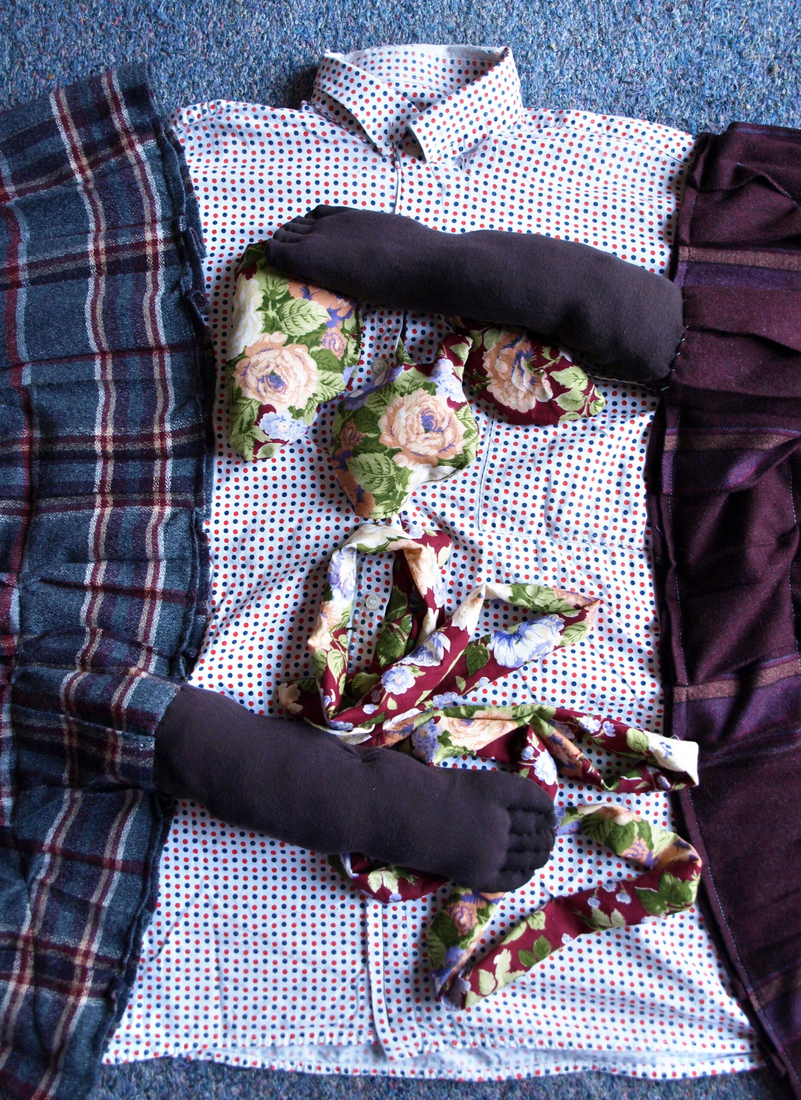 Μέσα από διαισθητικές διαδικασίες, υφάσματα και τυχαία αντικείμενα που βρίσκει, δημιουργεί γλυπτά που ισορροπούν μεταξύ της απεικόνισης και της αφαίρεσης, της έννοιας και της φόρμας.