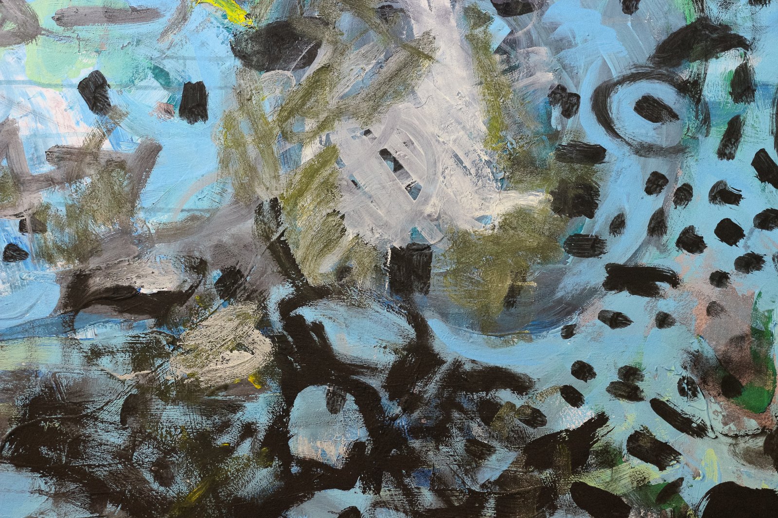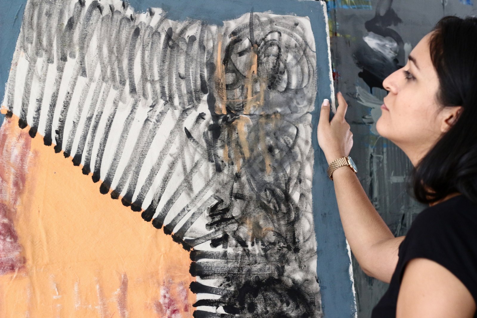 Το ατελιέ της είναι λιτό, φωτεινό κι ευρύχωρο. Η ζωγραφική της εμπνέεται από τα αφηγήματα του αφηρημένου εξπρεσιονισμού και τα έργα της πλημμυρίζουν από χρώμα.