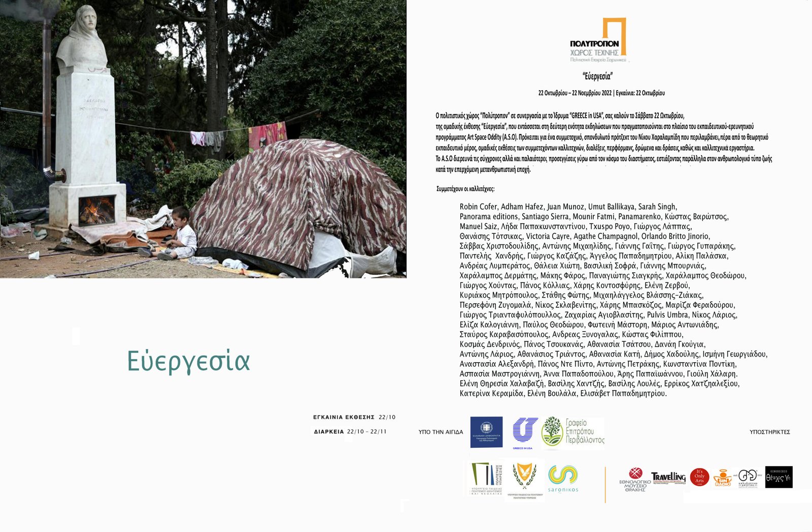 Ο πολιτιστικός χώρος ΠΕΣ ΠΟΛΥΤΡΟΠΟΝ και τo Ίδρυμα GREECE in USA, παρουσιάζουν την ομαδική έκθεση «Εύεργεσία». Η έκθεση αποτελεί μέρος της δεύτερης ενότητας εκδηλώσεων που πραγματοποιούνται στο πλαίσιο του ερευνητικού προγράμματος Art Space Oddity (A.S.O).