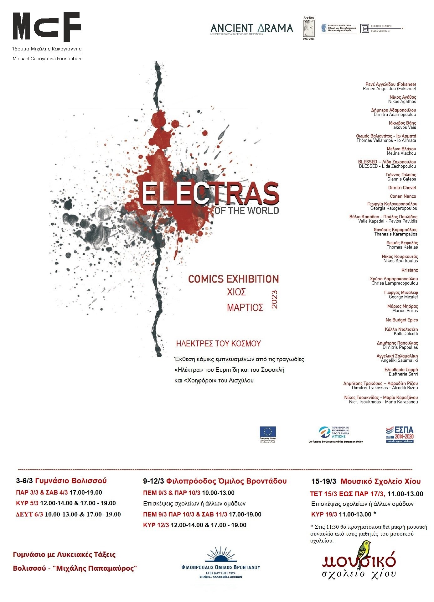 Από την Παρασκευή 3 Μαρτίου ως την Κυριακή 19 Μαρτίου 2023 η έκθεση κόμικς «Ηλέκτρες του Κόσμου» που διοργάνωσε το Ίδρυμα Μιχάλης Κακογιάννης στα πλαίσια του Θεσμού: «Αρχαίο Δράμα: Διεπιστημονικές και Δια-καλλιτεχνικές προσεγγίσεις» παρουσιάζεται στη Χίο.