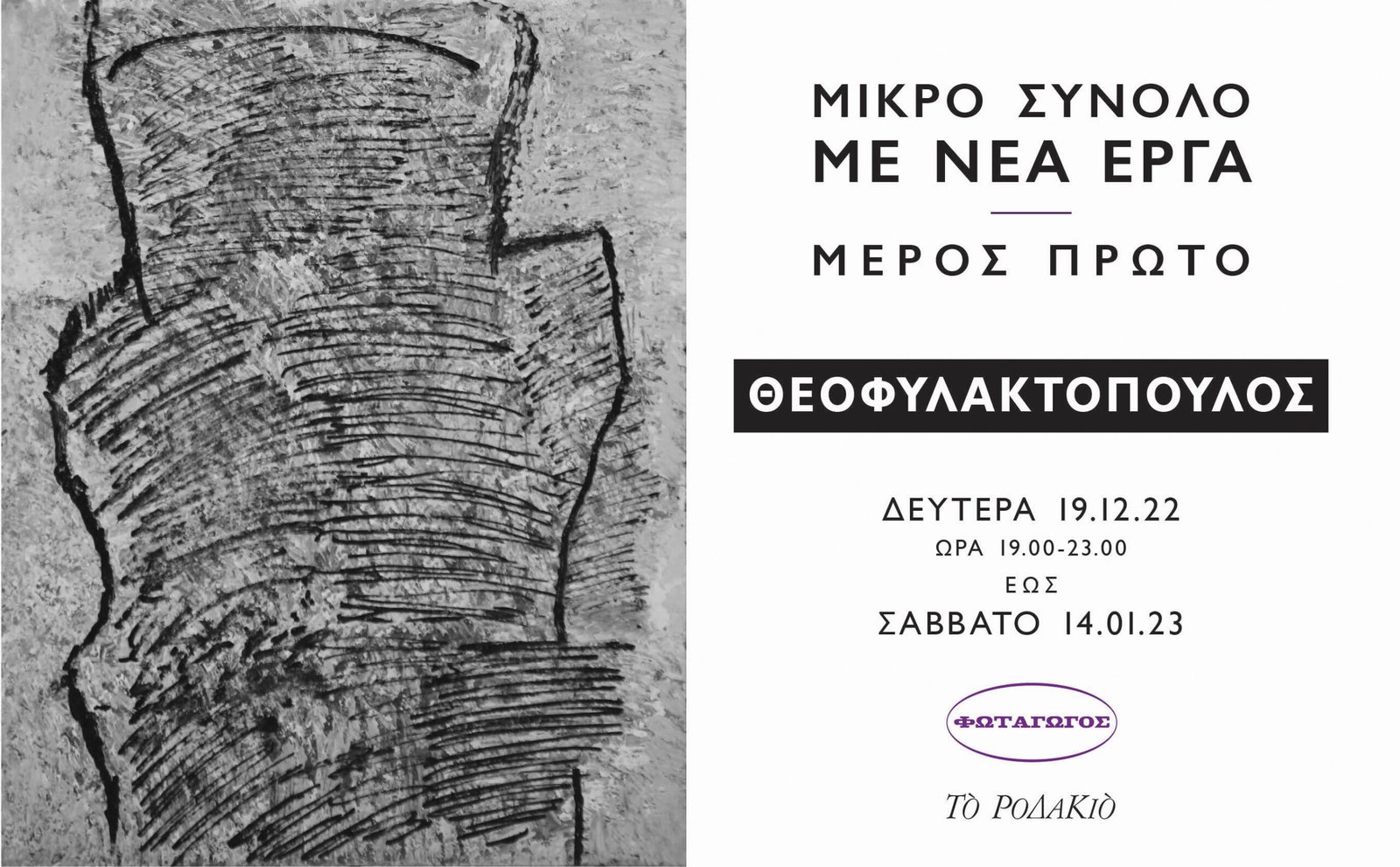 Έργα μικρών διαστάσεων που έγιναν το 2022 με μαρκαδόρους σε χαρτόνι εκθέτει ο Μάκης Θεοφυλακτόπουλος στο τέλος της χρονιάς και έχει σκοπό στα μέσα του Γενάρη του 2023 να παρουσιάσει πάλι εδώ, στον Φωταγωγό, το Μέρος Δεύτερο του Μικρού Συνόλου με Νέα Έργα.