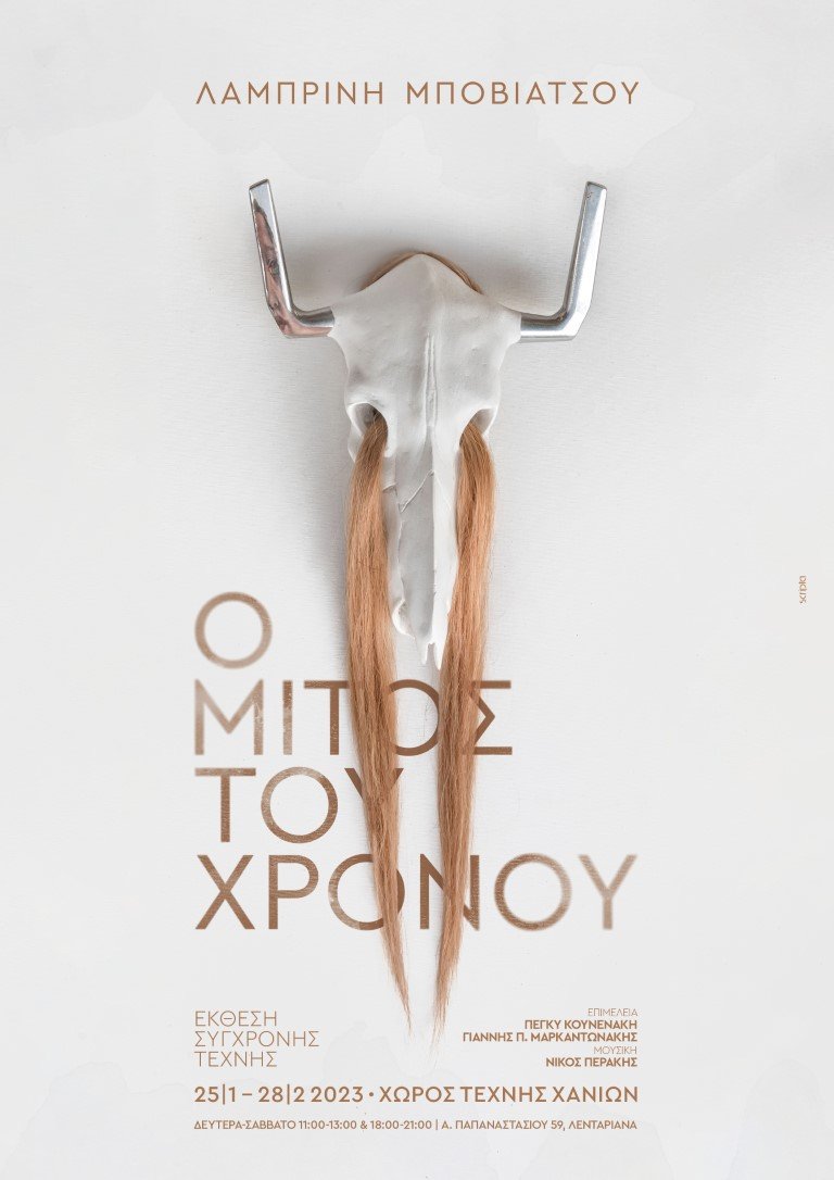 Στην ατομική της έκθεση με τίτλο «Ο Μίτος του Χρόνου» η εικαστικός Λαμπρινή Μποβιάτσου εμπνέεται από το μύθο της Αριάδνης και του Θησέα εστιάζοντας στο μίτο, το γνώριμο σύμβολο που οδηγεί από το σκοτάδι στο φως, από το φόβο στην απελευθέρωση του πνεύματος, στη γονιμότητα και την αναγέννηση της ύπαρξης.