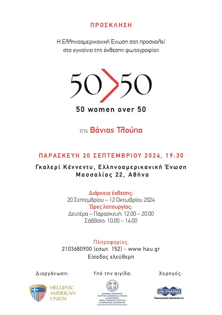 H Ελληνοαμερικανική Ένωση παρουσιάζει την έκθεση 50 women over 50 της γνωστής φωτογράφου Βάνιας Τλούπα υπό την αιγίδα της Γενικής Γραμματείας Ισότητας & Ανθρωπίνων Δικαιωμάτων. Η έκθεση εγκαινιάζεται την Παρασκευή 20 Σεπτεμβρίου 2024 στις 19:30, στην Γκαλερί Κέννεντυ της Ελληνοαμερικανικής Ένωσης και θα διαρκέσει έως και τις 12 Οκτωβρίου 2024.
