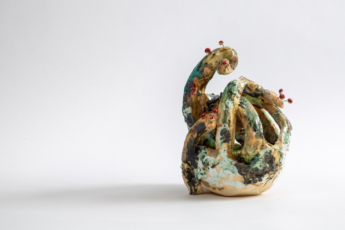 Κωνσταντίνα Μιχοπούλου: Εστιάζει σε κοινωνικά ζητήματα, όπως στερεότυπα, ρατσισμό, ταξικότητα, που τα εξερευνά μέσα από τις κεραμικές φόρμες σε συνδυασμό με τον πειραματισμό των υαλωμάτων.
