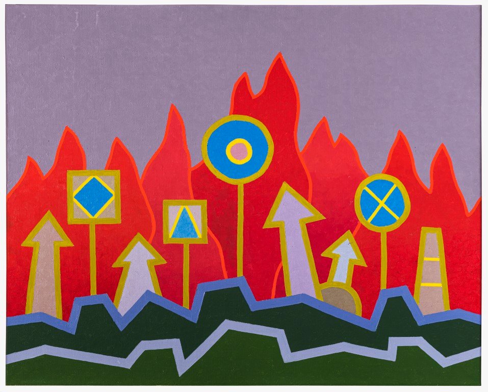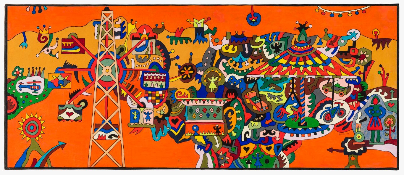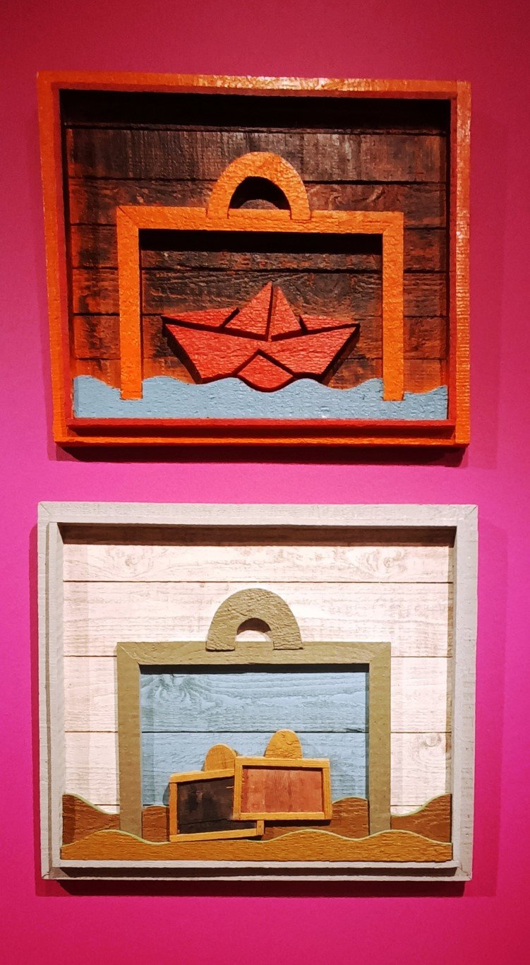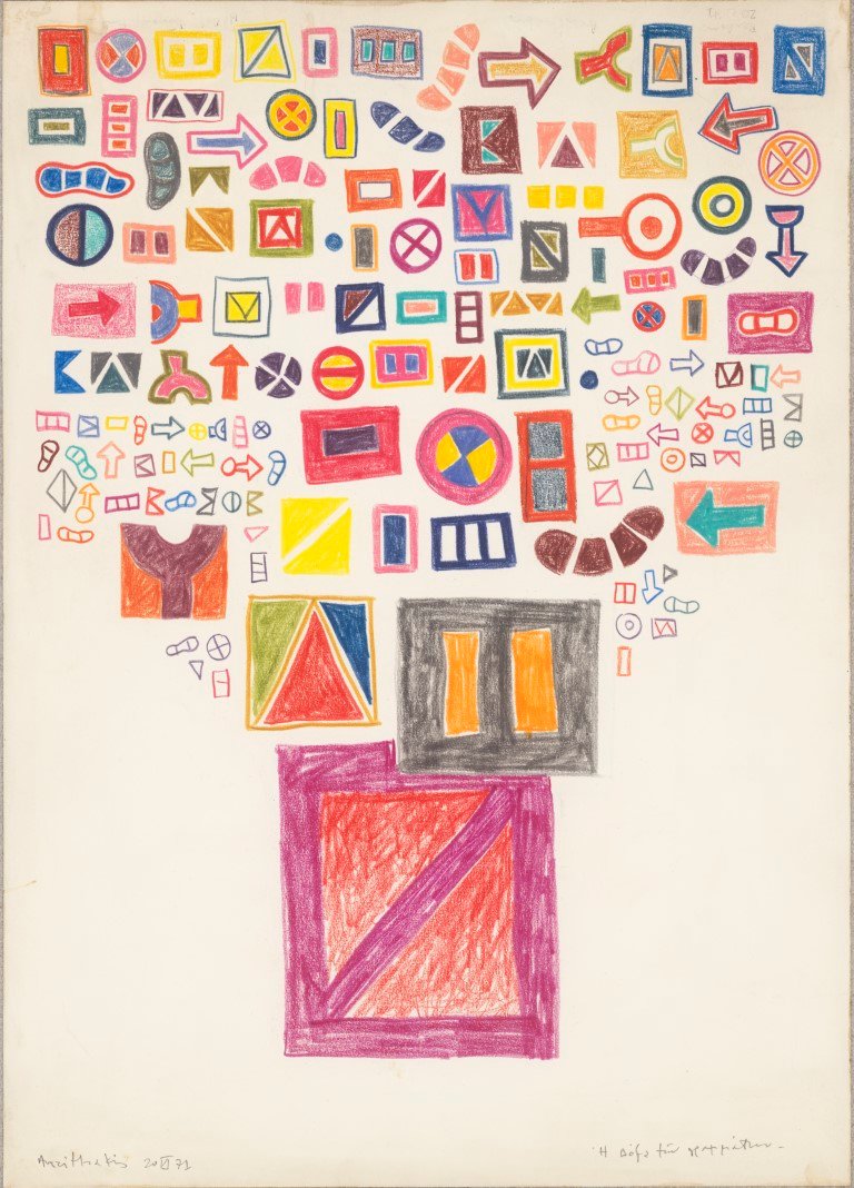Στον πυρήνα της αναδρομικής αναδεικνύεται η ταυτότητα ενός δημιουργού που μετέτρεψε τη ζωγραφική σε αφήγηση και προσωπικό ημερολόγιο εικόνων. Οι «ιστορίες» του οργανώνονται μέσα από μια αυστηρή αλλά ζωντανή γεωμετρία γραμμών, που οριοθετεί χώρο και χρόνο, ενώ τα επαναλαμβανόμενα σύμβολα — μάτια, καρδιές, βέλη, ήλιοι, εργοστάσια, καραβάκια και κυρίως η βαλίτσα — συγκροτούν ένα ιδιότυπο εικαστικό λεξιλόγιο. Όπως σε ένα κόμικ ή σε ένα λεξικό εικόνων, κάθε μοτίβο αποκτά σταδιακά πολλαπλές σημασίες· η επανάληψη δεν είναι εμμονή αλλά τρόπος σκέψης, μέσα από τον οποίο η εικόνα μετατρέπεται σε αφήγηση.