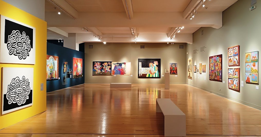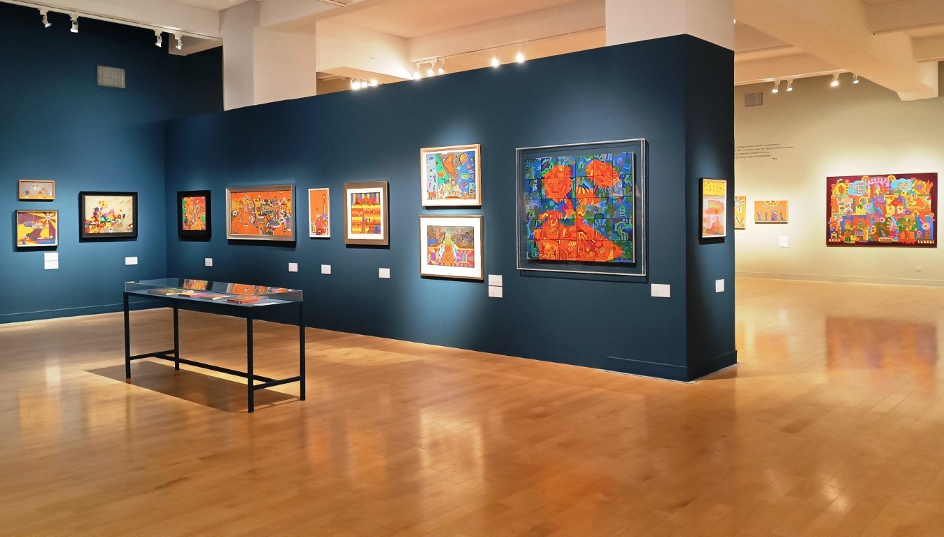Εκτός από το προσεγμένο στήσιμο των ενοτήτων, καθοριστικό ρόλο στην ανάδειξη των έργων διαδραματίζει και η χρωματική ταυτότητα του εκθεσιακού χώρου. Σχεδόν κάθε ενότητα αναπτύσσεται σε διαφορετικό, έντονο χρώμα τοίχου, δημιουργώντας μια ατμόσφαιρα που συνομιλεί άμεσα με τη ζωγραφική του Ακριθάκη. Οι χρωματισμένοι τοίχοι δεν λειτουργούν απλώς ως φόντο, αλλά ως ενεργό στοιχείο της αφήγησης, ενισχύοντας τη ζωντάνια, τις αντιθέσεις και την παλμική ένταση των έργων.