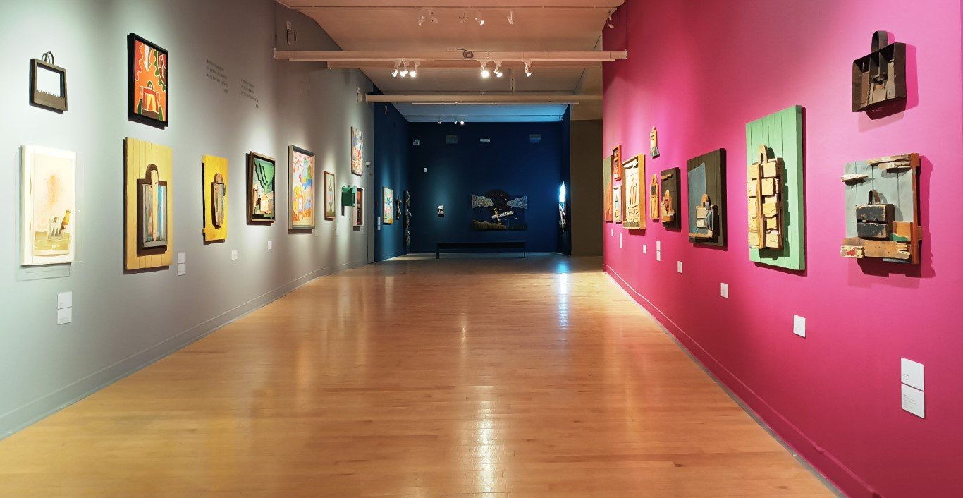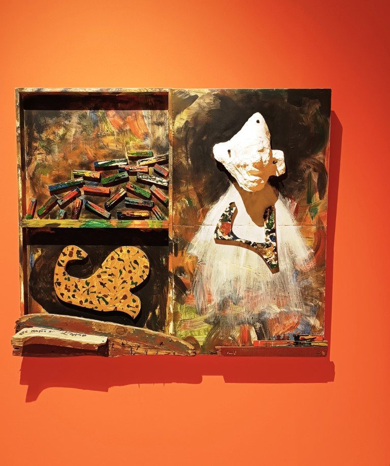 Η έκθεση οργανώνεται σε θεματικές ενότητες που φωτίζουν τις διαφορετικές περιόδους της δημιουργίας του. Από τις ψυχεδελικές τέμπερες της δεκαετίας του ’60 και τα πολιτικά έργα των αρχών του ’70 έως τις εμβληματικές «βαλίτσες», τις κατασκευές με θαλάσσια υλικά και φωτισμούς της δεκαετίας του ’80 και τα φορτισμένα έργα των τελευταίων χρόνων — ανάμεσά τους και οι μορφές του Δρομοκαΐτειου — η διαδρομή του αποτυπώνεται ως μια συνεχής ταλάντωση ανάμεσα στο παιγνιώδες και το δραματικό.