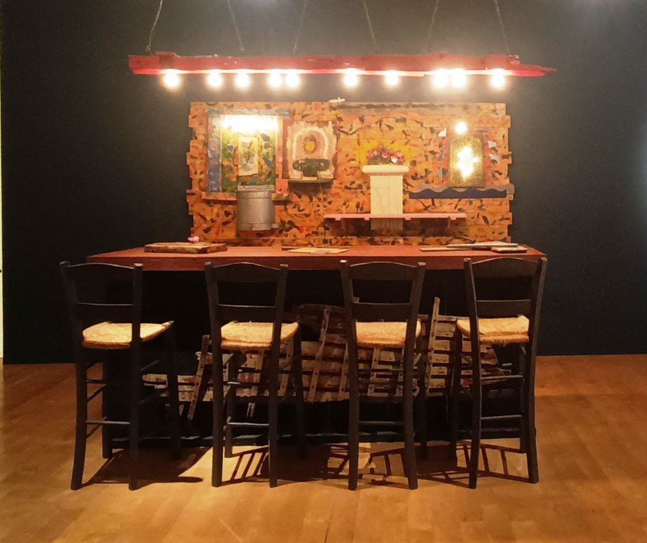 Ιδιαίτερη θέση κατέχει και το “Μπαρ” (1981), η μεγαλύτερη κατασκευή του, ένα έργο που αγγίζει τα όρια της εγκατάστασης και μετατρέπει την τέχνη σε εμπειρία κοινωνικότητας — έναν χώρο όπου η δημιουργία συναντά την καθημερινότητα, ισορροπώντας ανάμεσα στην ευφορία και σε μια υπόγεια αίσθηση εύθραυστης ισορροπίας.