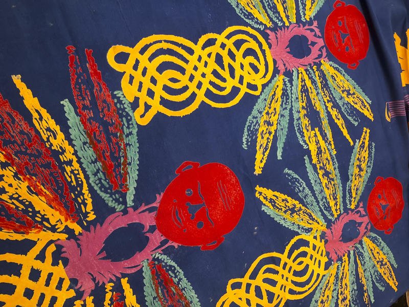 Each piece was created through a fully manual process: the carved wooden matrix is dipped in pigment, carefully pressed onto fabric, and hand-stamped to bring the image to life. This repeated gesture takes on the cadence of a moving meditation. The sensory experience is rooted in the materials themselves—carved wood, raw fabric, the scent of pigments. Hand printing becomes a spiritual and artisanal ritual, in which the artist’s inner world is embodied in the act of making.
