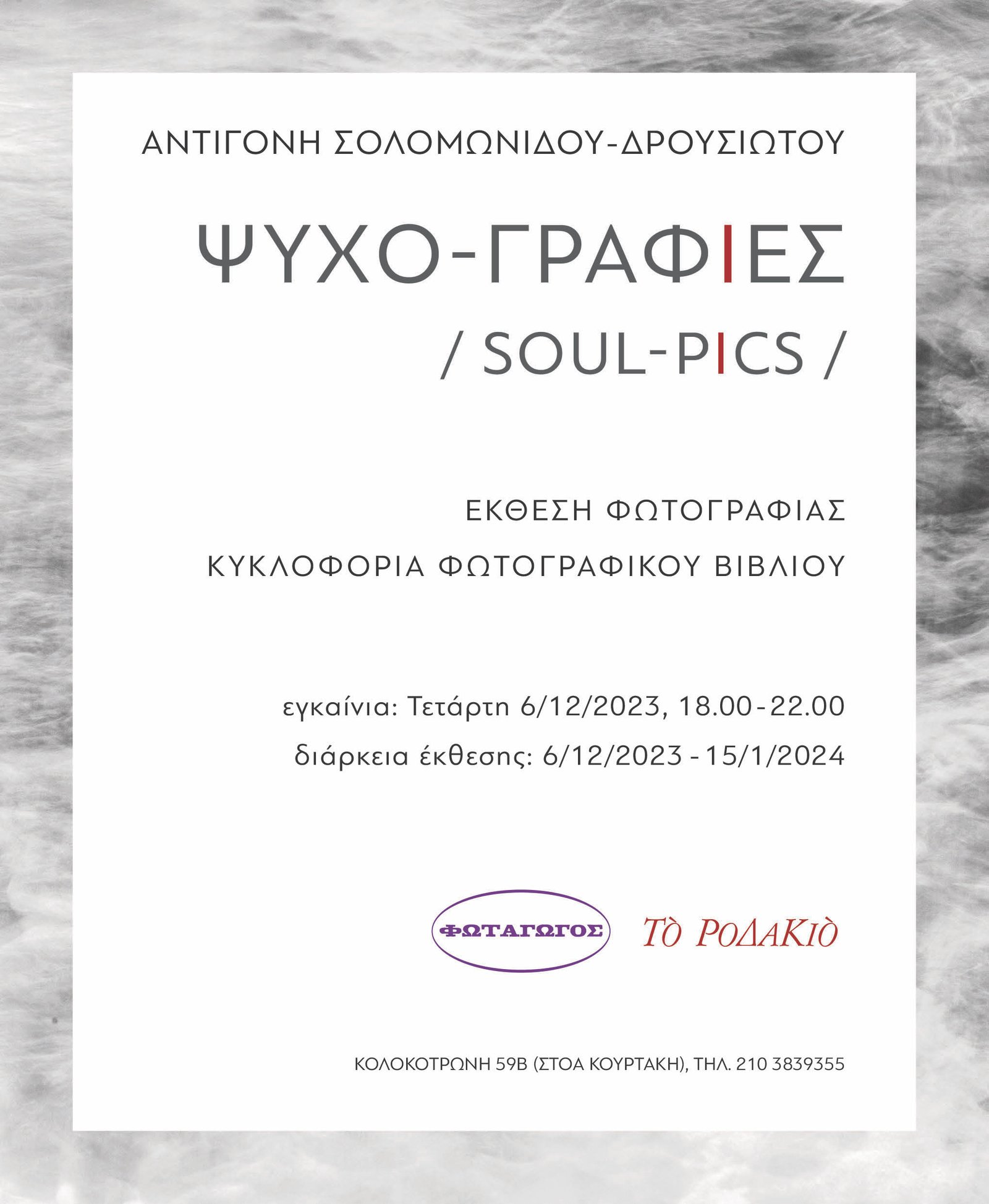Και από τις εκδόσεις «Το Ροδακιό» κυκλοφορεί την ίδια μέρα το δίγλωσσο βιβλίο με τον τίτλο «ΨΥΧΟ-ΓΡΑΦΙΕΣ / SOUL-PICS». Περιλαμβάνει 54 φωτογραφίες της Αντιγόνης Σολομωνίδου – Δρουσιώτου που μοιράζονται στις ενότητες «εκ φωτός…» και «…εν σώματι», πρόλογο από την Ιστορικό Τέχνης και επιμελήτρια εκθέσεων Μπία Παπαδοπούλου, και την ποιητική ενότητα «Θραύσματα» του Κύπριου συγγραφέα Αντώνη Γεωργίου.