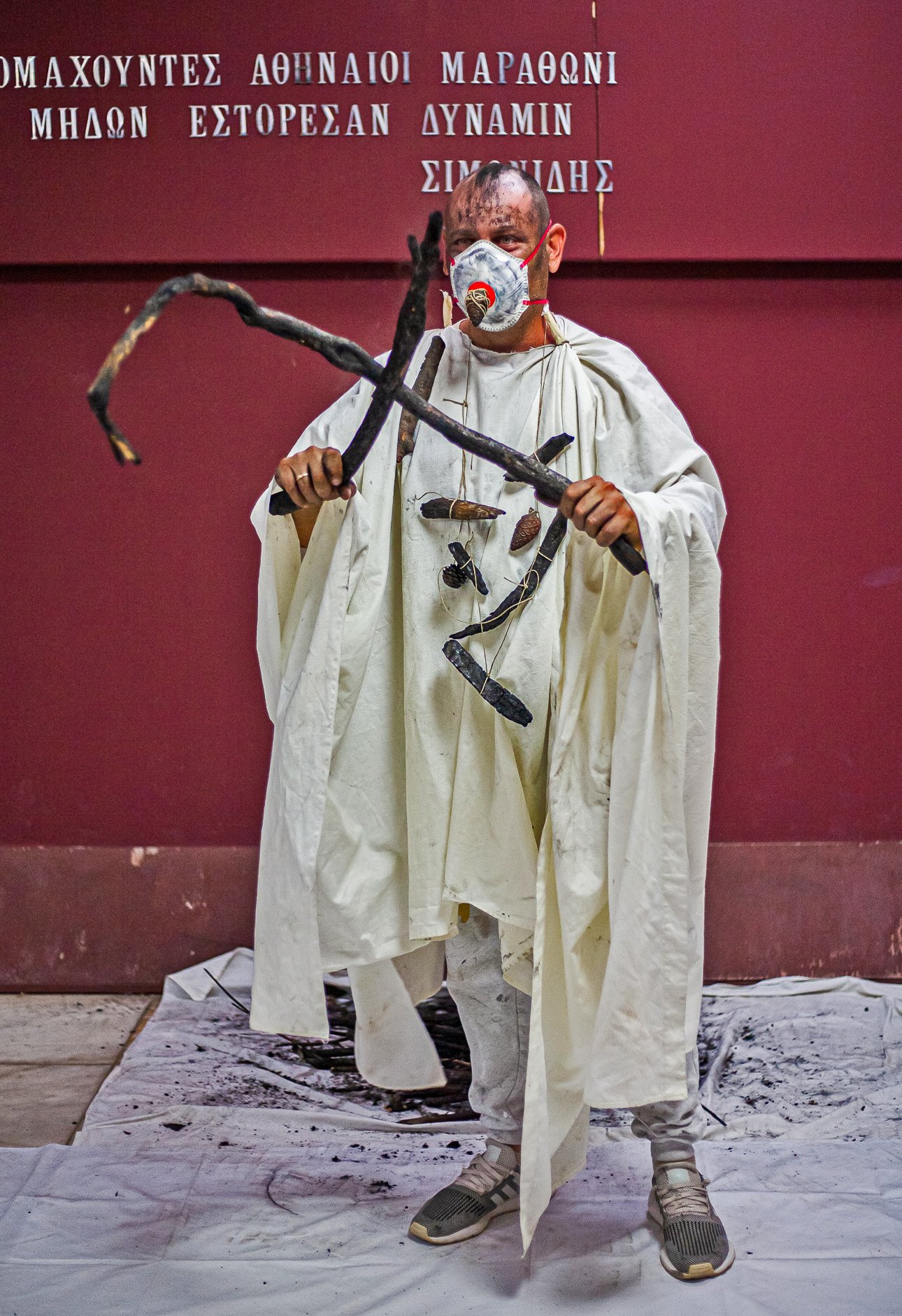 Ο εικαστικός με καταγωγή την Ιστιαία, ζει και εργάζεται στον τόπο που βίωσε την ανείπωτη καταστροφή. Τα υλικά που χρησιμοποίησε, απομεινάρια, αποκαΐδια της πύρινης λαίλαπας, έγιναν το μέσο για να εκφράσει τη θλίψη αλλά και την οργή για το αποτέλεσμα που θα μείνει για δεκάδες χρόνια ορατό σε όλους.