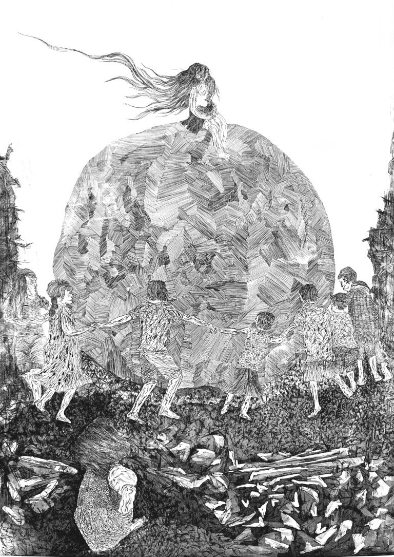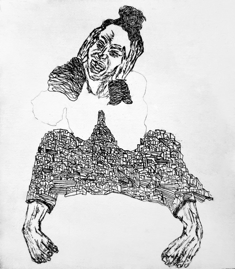 This new body of work is fueled by the condition of our times and the material of everyday life, translating the social and psychological vibrations of today into images. The lived contradictions of contemporary existence and social alertness are expressed through harsh black-and-white contrasts and a nervous line that becomes a vehicle for feelings and thoughts, revealing the artist’s worldview. Bodies towering like raised fists, hunched figures, faces with traditional veils, and the semiology of a bird, a balloon, or tightly interlaced fingers, loudly convey the creator’s intent for a social and spiritual awakening that has become an urgent necessity. Her works are articulated as forms of reaction, balancing between despair and hope, which inevitably define the emotional impact of current human experience.