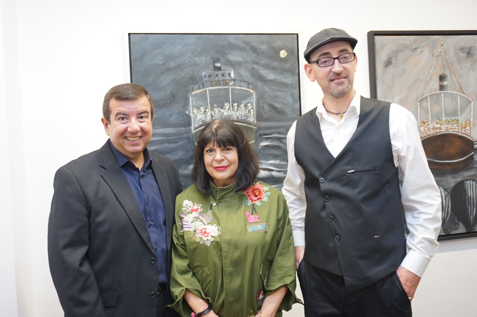 Η εικαστικός Αγγελική Μπόμπορη, ο υπεύθυνος επικοινωνίας της έκθεσης κ. Δημήτρης Λαζάρου και ο ζωγράφος Σπύρος Λύτρας |