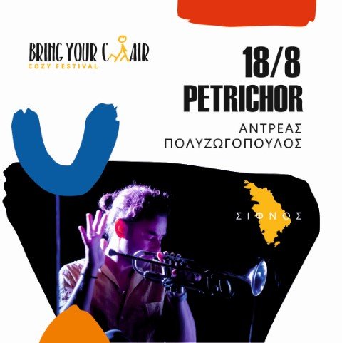 «πετριχώρ», όπως ονομάζεται στα ελληνικά, είναι η χαρακτηριστική μυρωδιά που αναδύεται από το έδαφος όταν πέφτουν πάνω του οι σταγόνες της βροχής και συχνά ξυπνά συναισθήματα νοσταλγίας, σηματοδοτώντας την έναρξη του φθινοπώρου ή της άνοιξης. Στο πλευρό του συνθέτη, ο Κώστας Κωνσταντίνου στο κοντραμπάσο και ο Wajdi Riahi στο πιάνο. Παρά την απουσία ντράμερ, το τρίο καταφέρνει να διατηρεί μια σταθερή και δυναμική ρυθμική αίσθηση. Συνδιοργάνωση με την Εφορεία Αρχαιοτήτων Κυκλάδων και με τον Πολιτιστικό Σύλλογο Σίφνου.