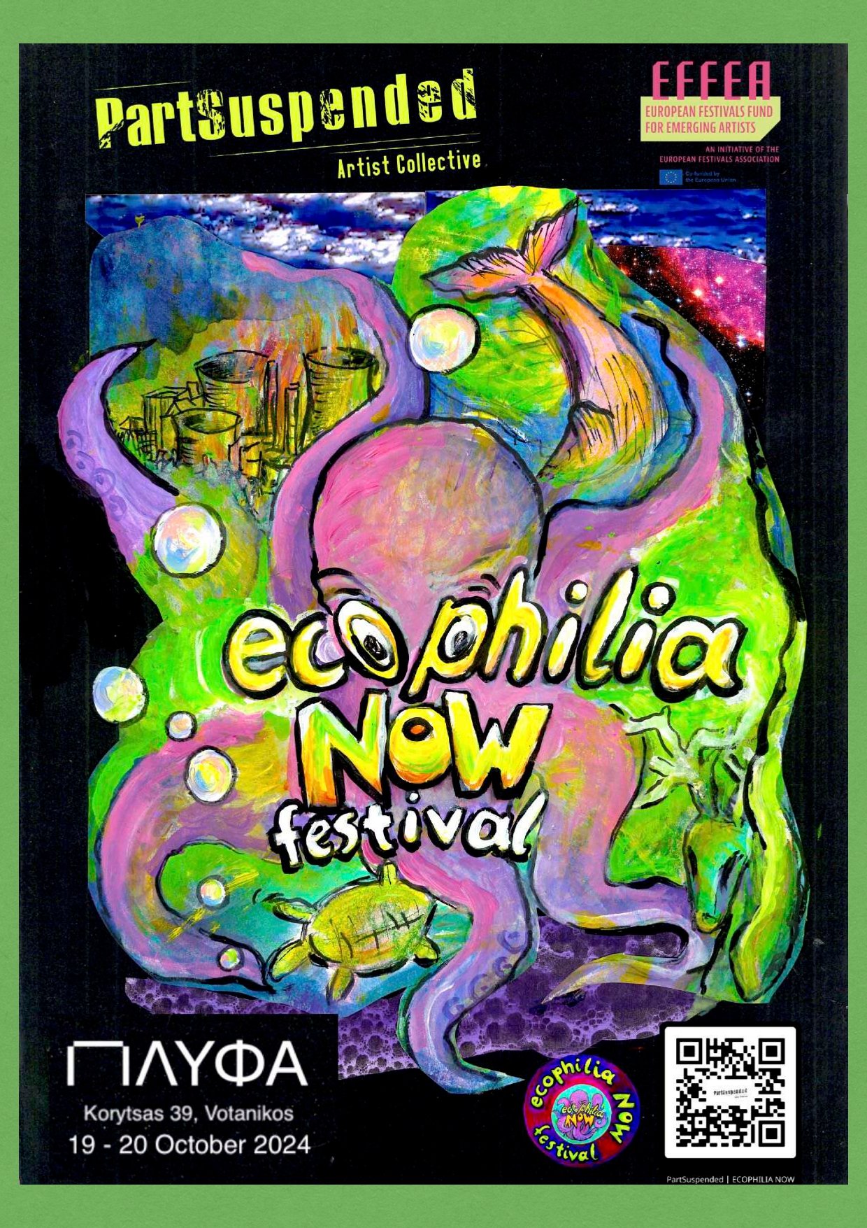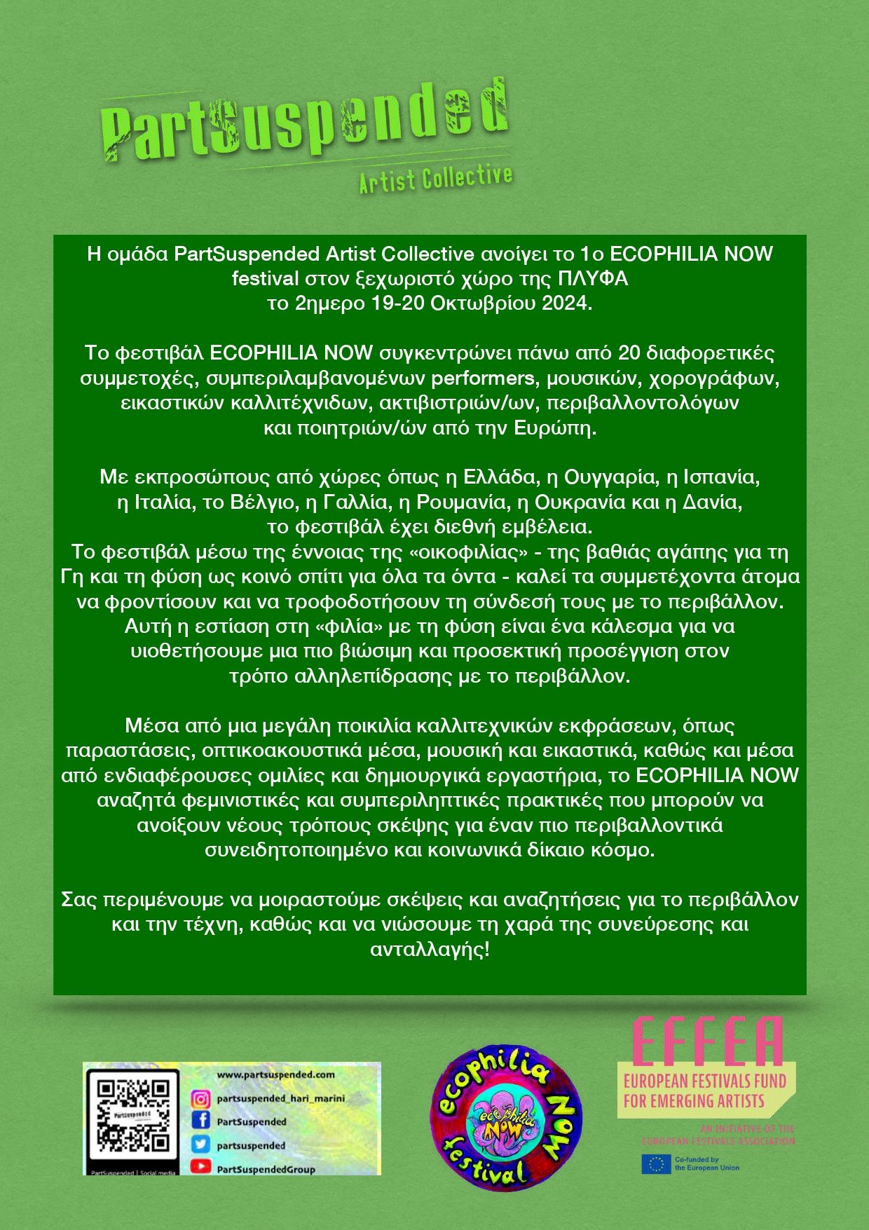 Η ομάδα PartSuspended Artist Collective ανοίγει το 1ο ECOPHILIA NOW Festival στον ξεχωριστό χώρο της ΠΛΥΦΑ ( Κορυτσάς 39, Βοτανικός 104 47 ) το 2ημερο 19 - 20 Οκτωβρίου 2024.