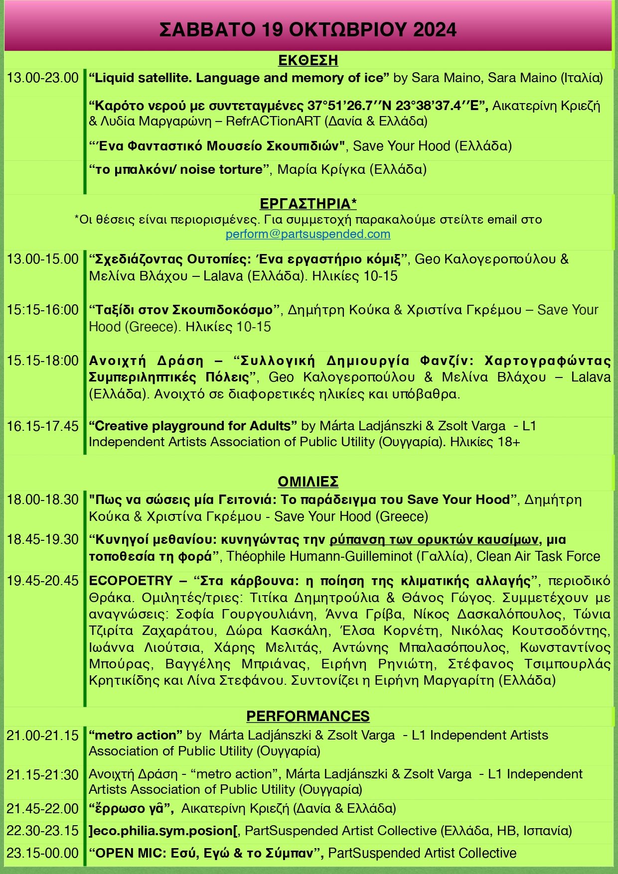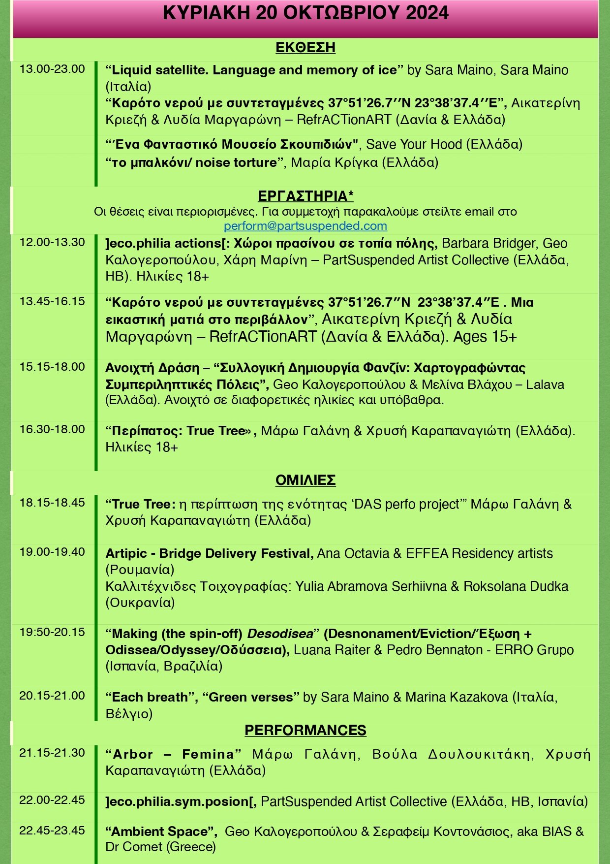 *Για τα Εργαστήρια οι θέσεις είναι περιορισμένες. Για συμμετοχή παρακαλούμε στείλτε email στο perform@partsuspended.com