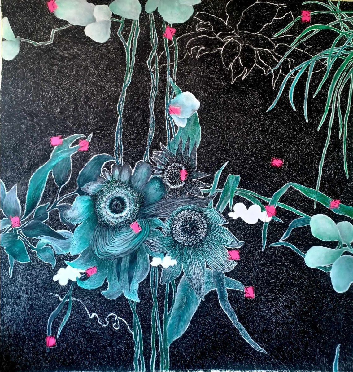 In this new work, she resorts to the theatre. And indeed – where else – in the theatre of the absurd. The exhibition’s title Wonderful Times refers directly and indirectly to Samuel Beckett’s play Oh les beaux jours/ Happy Days (Oh! The Good Days/Happy Days). Here we should assume Theofylaktou as another Winnie, buried up to the neck, while “the garbage dump around looks like a flower-strewn fortress”, as she writes in her personal notes. Another heavenly day. Begin, Winnie. Begin your day, Winnie. Another day. The imagery of the works shines through a heavy inner mourning, which however flows into the joy of things. It can’t be done otherwise. There is no other way to move on from this incessant come-and-go but insist to on celebrating and dreaming amongst the ruins. A bittersweet feeling emerges. A world, where everything still happens. It’s her feeling of a grieving celebration, but she doesn’t want to accept defeat. Theofylaktou’s ability to see and assemble things has not changed. Perhaps more than ever there is a reflection. A quietness, that is a new element of hers. Silence is more visible. The colours dominate, with the tones of black and grey to propose grieving.