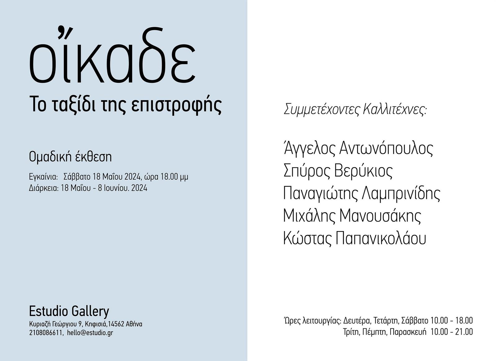 Η ομαδική εικαστική έκθεση με τίτλο Οἴκαδε. Το ταξίδι της επιστροφής προσκαλεί τους θεατές στην εξερεύνηση της έννοιας της επιστροφής στον οικείο χώρο του ανήκειν. Μέσα από ένα ευρύ φάσμα εικαστικών μέσων και προσεγγίσεων, πέντε καταξιωμένοι σύγχρονοι Έλληνες εικαστικοί, ο Άγγελος Αντωνόπουλος, ο Σπύρος Βερύκιος, ο Παναγιώτης Λαμπρινίδης, ο Μιχάλης Μανουσάκης και ο Κώστας Παπανικολάου επιχειρούν ένα ταξίδι αναστοχασμού, που ξεπερνά τη στενή χωρική αντίληψη του οικιακού χώρου, και προσκαλεί τους θεατές σε μια βαθύτερη κατανόηση του τι σημαίνει να βιώνεις έναν οικείο τόπο, συναισθηματικά, πνευματικά και φαντασιακά. Η διερεύνηση της έννοιας του σπιτιού επιχειρείται μέσα από μια πολυεπίπεδη ανάδειξη των ψυχοκοινωνικών αναπαραστάσεων του κατοικείν, της συναισθηματικής διάστασης του δεσμού με τον οικείο χώρο και της πολιτισμικής αξίας του στη διαμόρφωση της προσωπικής ταυτότητας.