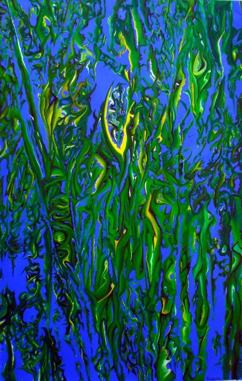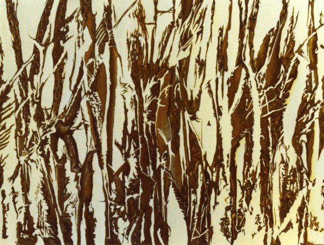 In his early etchings of botanical content made between 1974 – 1980, the focus is on minimal and extended forms reminiscent of clusters of branches and tree trunks, as well as complex nexuses of hybrid plants in intricate, pulsating arrangements. Similar themes are explored in the paintings of that time. With references to earlier etchings, Pandolfini picks out and isolates details of imprints from botanical compositions, which he then blows-up and transfers onto large-scale paintings of vibrant colors, soft textures, fluid forms and surrealistic elements.