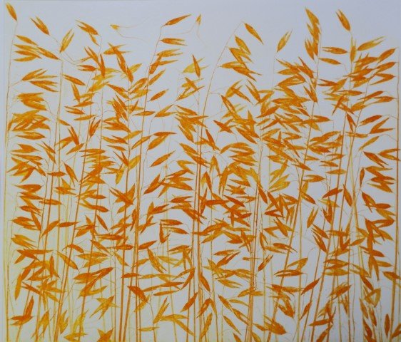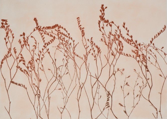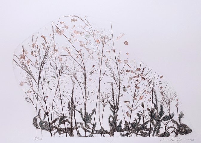 In the recent series of prints which he started in 2020, his interest revolves around the fragile and delicate forms of plants. Slender yet resilient, they follow the arbitrary flow of the wind; bowing, resisting and responding to the spontaneous natural motion and force that the air has upon them. It is in this organic rustling that the artist unveils the entropy of time and the poetics of the fleeting moment, in an attempt to capture and convey its rhythm, motion and impression through the imprint. With a combination of techniques, first founded on the direct imprint of leaves and plants onto the matrix and then on the intellectual and creative mediation of the artist in processing the materials, Pandolfini reclaims the energy of his initial ephemeral encounter with the landscape and the Greek flora.