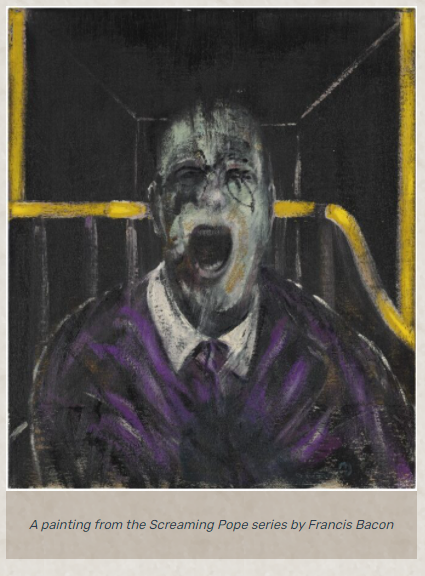 Bacon commands a very high price. His Three Studies of Lucian Freud sold at Christie’s New York in 2013 for $142.4 million—the highest auction prize of a work of art at that time. Bacon, a devout atheist, made more than 40 portraits of popes over a 20-year period.