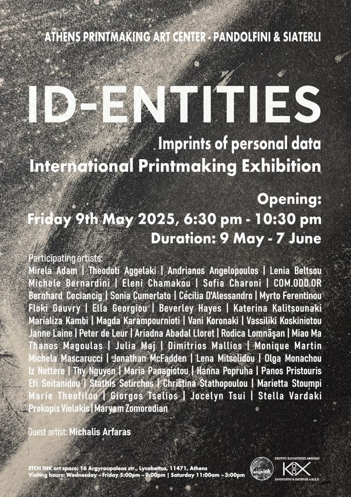 Το ΚΕΝΤΡΟ ΧΑΡΑΚΤΙΚΗΣ ΑΘΗΝΩΝ - PANDOLFINI & ΣΙΑΤΕΡΛΗ Α.Μ.Κ.Ε. παρουσιάζει τη διεθνή έκθεση χαρακτικής ID-ENTITIES: Αποτυπώσεις προσωπικών δεδομένων με έργα διεθνών και Ελλήνων δημιουργών, στο χώρο τέχνης ETCH INK από τις 9 Μαΐου έως τις 7 Ιουνίου 2025.