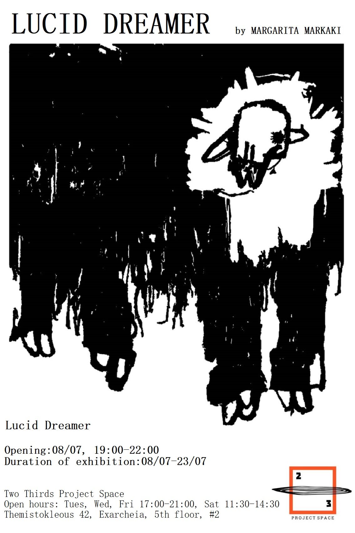 Η πρώτη ατομική έκθεση Lucid Dreamer της Μαργαρίτας Μαρκάκη, είναι ένας φανταστικός κόσμος φτιαγμένος από ένα προσωπικό σύστημα μοτίβων, αρχέτυπων, σουρεαλιστικών χαρακτήρων και αινιγματικών εικόνων με επιρροές από τη φύση, την Ιστορία της Τεχνης και την Ποπ κουλτούρα.