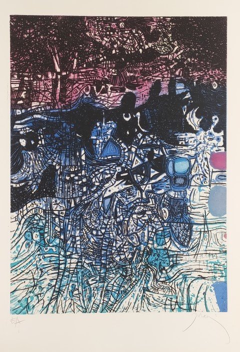 Selected prints from the George Kostopoulos Collection will inaugurate the exhibition program of the spring season at ETCH INK art space, presenting unique and rare works from the collection to the audience, bringing visual artists, theoreticians, art lovers and researchers in touch with the Marios Prassino’s artistic body of works. The exhibition features large-scale etchings and silkscreens, illuminating aspects of the pioneering artist’s trajectory, with a focus on his prints, a part of his oeuvre which is less widespread and less known to the Greek audience. Prassinos’ print production is directly connected to his book illustrations of classical literary works and poems. The exhibition also presents the entire series of coloured etchings for the illustration of Arthur Rimbaud’s renowned poem “Une saison en enfer” (A season in hell), which he created in 1966 for Les Bibliophiles Comtois publications.