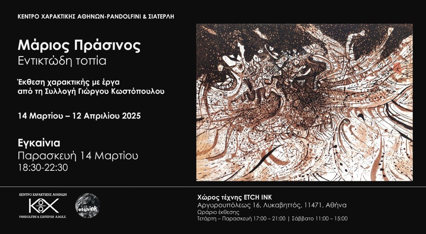 Το ΚΕΝΤΡΟ ΧΑΡΑΚΤΙΚΗΣ ΑΘΗΝΩΝ – PANDOLFINI & ΣΙΑΤΕΡΛΗ Α.Μ.Κ.Ε. παρουσιάζει την αφιερωματική έκθεση Μάριος Πράσινος: Ενστικτώδη τοπία με έργα χαρακτικής από τη Συλλογή Γιώργου Κωστόπουλου στο χώρο τέχνης ETCH INK από τις 14 Μαρτίου έως τις 12 Απριλίου 2025.