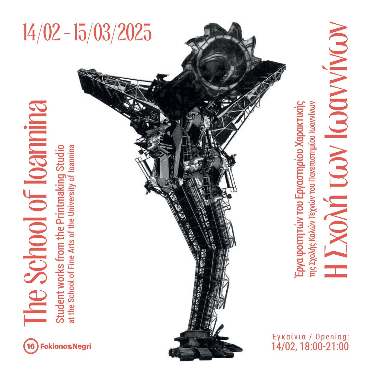 The “other Arcadia” Foundation, aiming to support young creators and enhance the visibility and communication of their work with the Athenian artistic community, invites for the second time the Printmaking Studio of the School of Fine Arts, University of Ioannina, to the 16 Fokionos Negri. “The School of Ioannina” brings together over twenty-five works by students of the , showcasing the diverse expressive possibilities of printmaking as a contemporary artistic form. Using a wide range of techniques—from woodcut to etching—as well as incorporating printmaking techniques into the creation of painting works, the exhibition reveals the creative variety and technical mastery of printmaking.