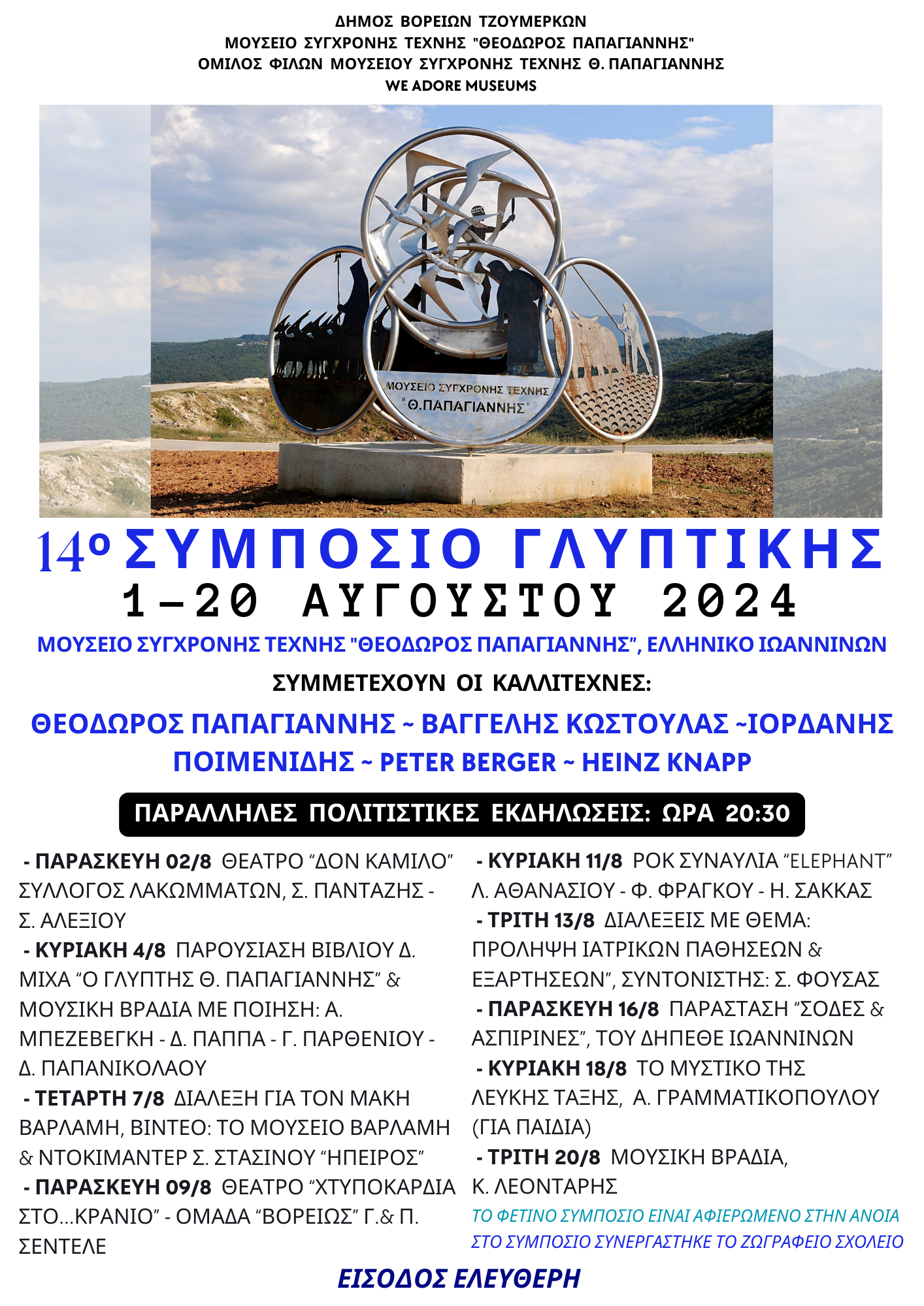 Το Μουσείο Σύγχρονης Τέχνης «Θεόδωρος Παπαγιάννης» ( The “Theodoros Papagiannis” Museum of Contemporary Art ) σας προσκαλεί στο 14ο Συμπόσιο Γλυπτικής και τις παράλληλες εκδηλώσεις του που θα λάβουν χώρα από 1 έως και 20 Αυγούστου 2024, στον αύλειο χώρο του Μουσείου, στο Ελληνικό Ιωαννίνων. Όλες οι παράλληλες πολιτιστικές εκδηλώσεις θα πραγματοποιηθούν στις ημερομηνίες που αναφέρονται παρακάτω και ώρα 20.30. Το 14ο Συμπόσιο διοργανώνουν από κοινού ο Δήμος Βορείων Τζουμέρκων, το Μουσείο Σύγχρονης Τέχνης “Θεόδωρος Παπαγιάννης”, ο Όμιλος Φίλων του Μουσείου Σύγχρονης Τέχνης “Θ. Παπαγιάννης” και ο πολιτιστικός οργανισμός WE ADORE MUSEUMS.