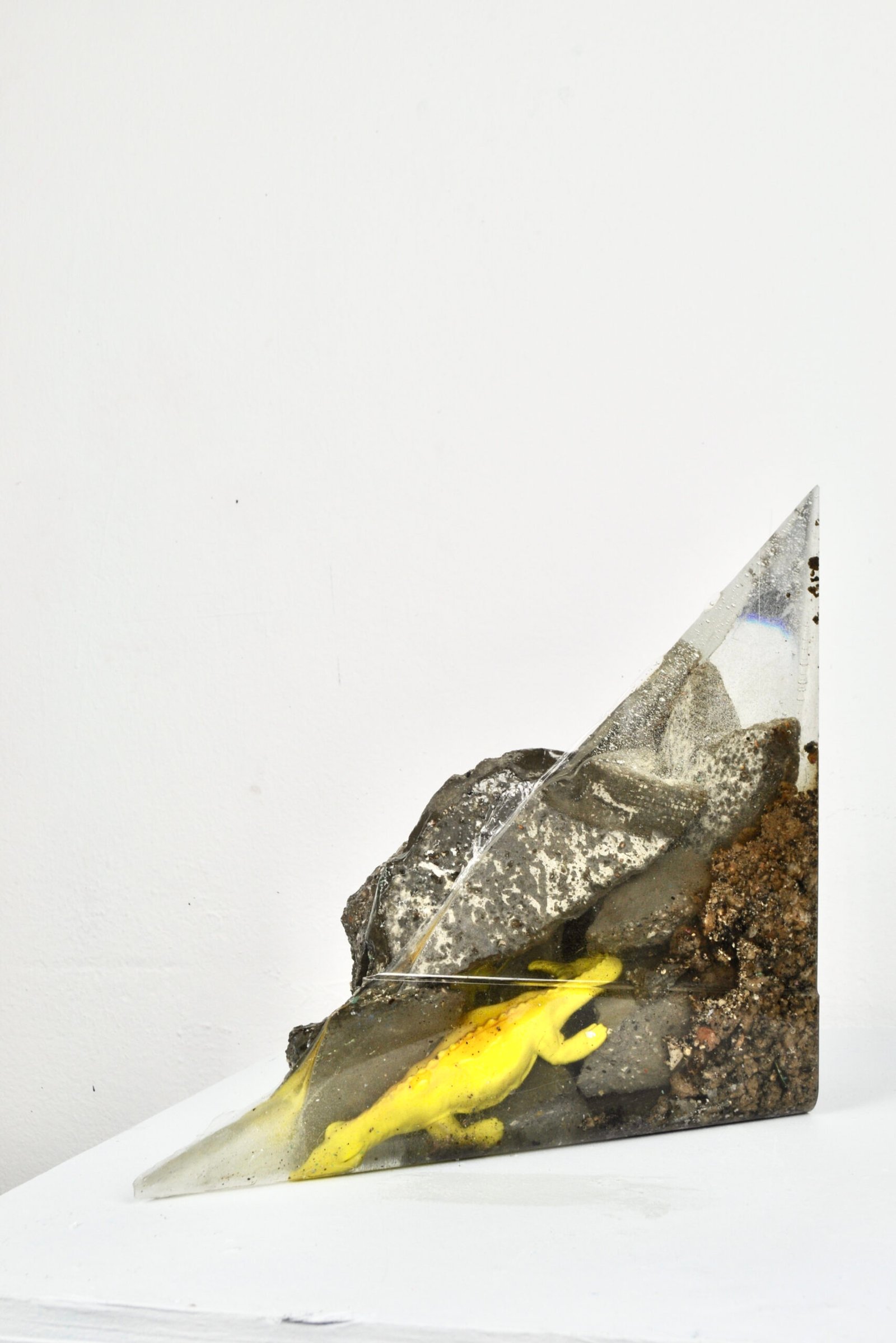 Η διάθλαση του φωτός αποσταθεροποιεί τη ματιά σου και ταυτόχρονα δίνει σε αυτά τα γλυπτά μια διαρκώς μεταβαλλόμενη όψη. Πρόκειται για μια «γεωλογική γλυπτική», που συνδέεται με το έδαφος, τη φθορά, την αταξία και την εντροπία.