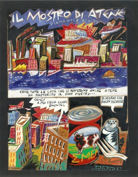 Σε ένα ανάλογο πλαίσιο, η δεκαετία του ’80 αποτέλεσε ένα σημαντικό κεφάλαιο για την Ελλάδα, με μια νέα γενιά Ελλήνων καλλιτεχνών να συμμετέχει ενεργά σε αυτή τη δημιουργική ανταλλαγή. Η περίοδος σηματοδότησε την άνθηση των ελληνικών περιοδικών κόμικς, όπως η “Βαβέλ”, το “Παρά Πέντε”, καθώς και την έκδοση αναρίθμητων φανζίν, φθηνών αυτοεκδόσεων σε χαρτί φωτοτυπίας, οι οποίες κυκλοφορούσαν από χέρι σε χέρι. Τα συγκεκριμένα περιοδικά έγιναν πλατφόρμες για νέους ταλαντούχους καλλιτέχνες να εξερευνήσουν νέες ιδέες και νέους τρόπους έκφρασης συνδυάζοντας στοιχεία από τη λαϊκή κουλτούρα των κόμικς, τη γραφιστική με παραδοσιακές εικαστικές τεχνικές. Μέσα από τις σελίδες των περιοδικών αυτών, καλλιτέχνες όπως ο Διαμαντής Αιδίνης, ο Σπύρος Βερύκιος, ο Δημήτρης Παπαϊωάννου και ο Κωνσταντίνος Παπαμιχαλόπουλος, που συμμετέχουν και στην έκθεση, είχαν τη δυνατότητα να αναδείξουν νέες αισθητικές προσεγγίσεις, προσφέροντας έτσι ένα πλούσιο φάσμα εναλλακτικών προτάσεων για το τι μπορεί να είναι η ζωγραφική και το κόμικ στο κοινό.